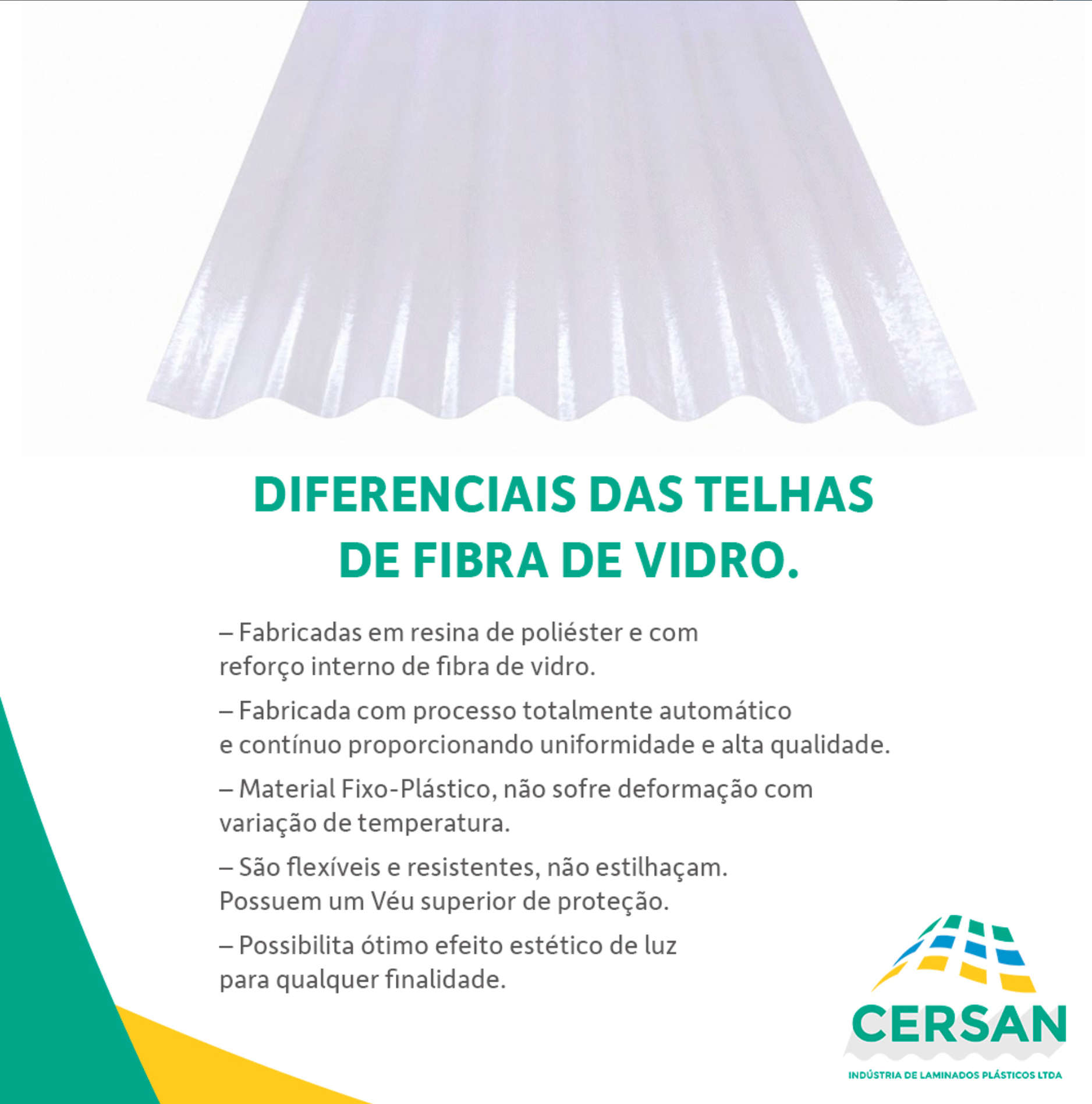As telhas de fibra de vidro são produzidas com alta qualidade e segurança, proporcionando iluminação natural e economia de energia. Não se deformam com o tempo e não estilhaçam, garantindo a segurança de todos.